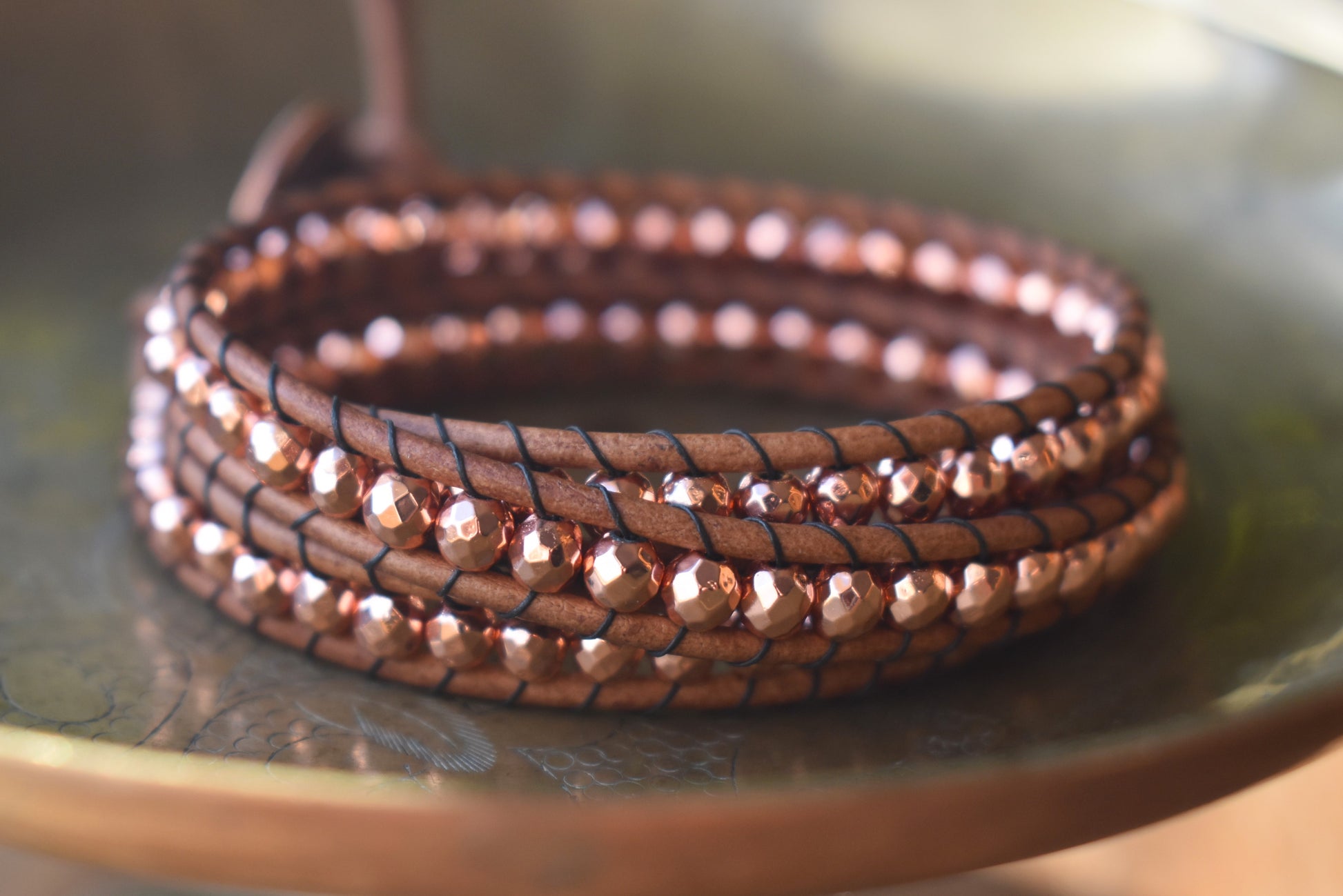 Copper/Rose Gold Tone Faceted Hematite Wrap Bracelet // Leather Bracelet // Beaded Bracelet