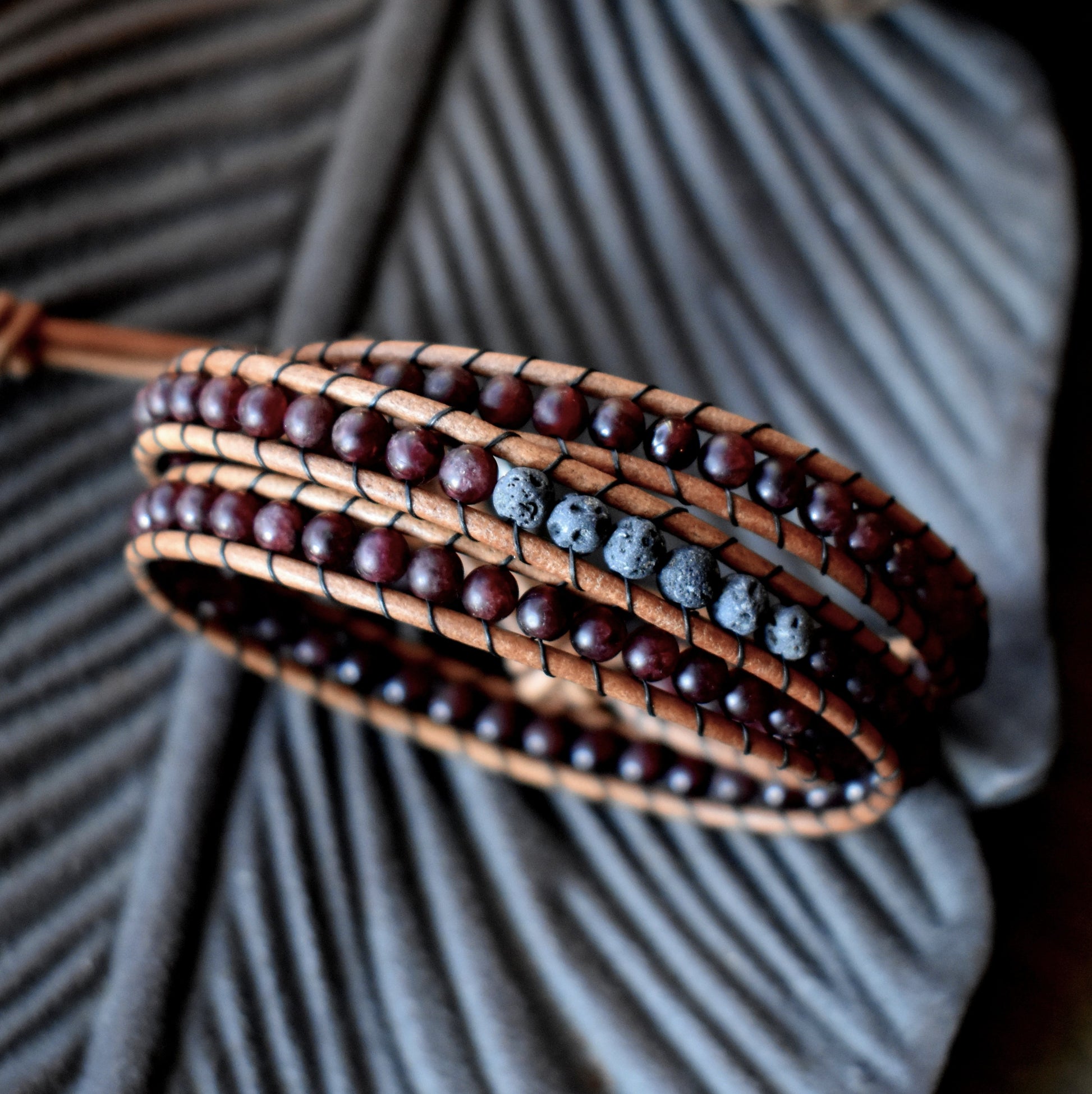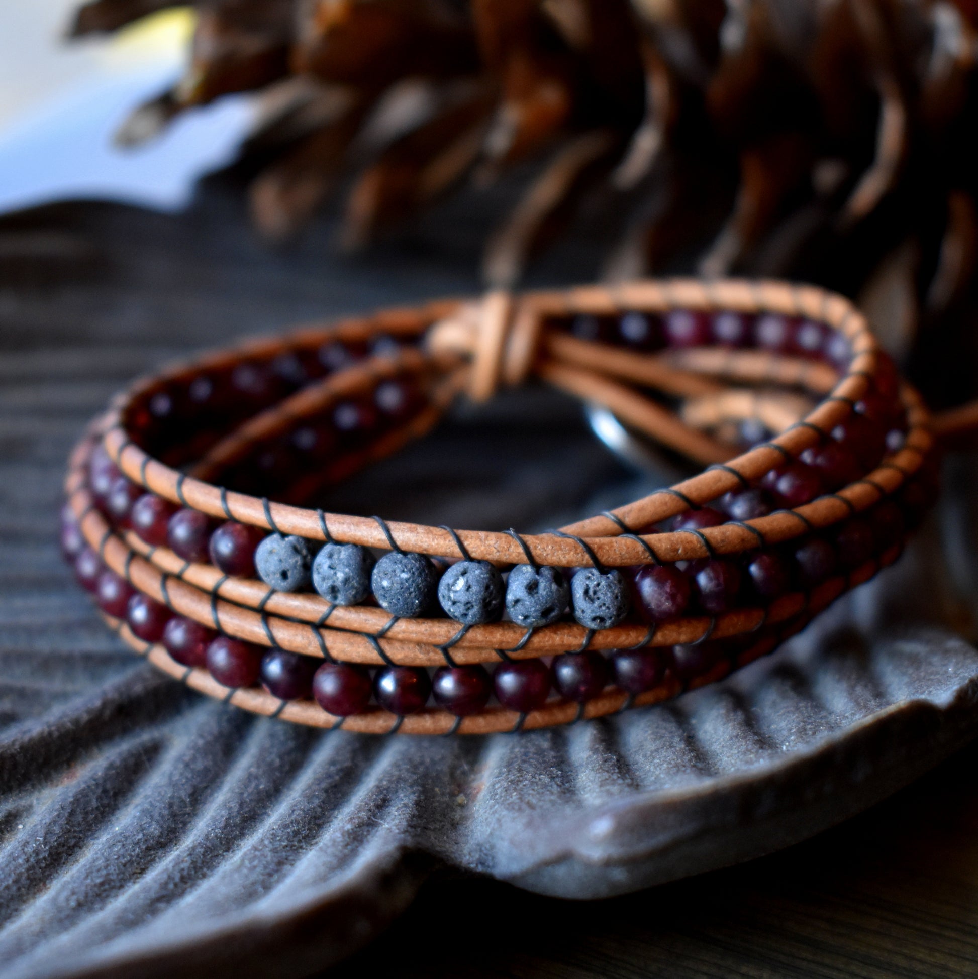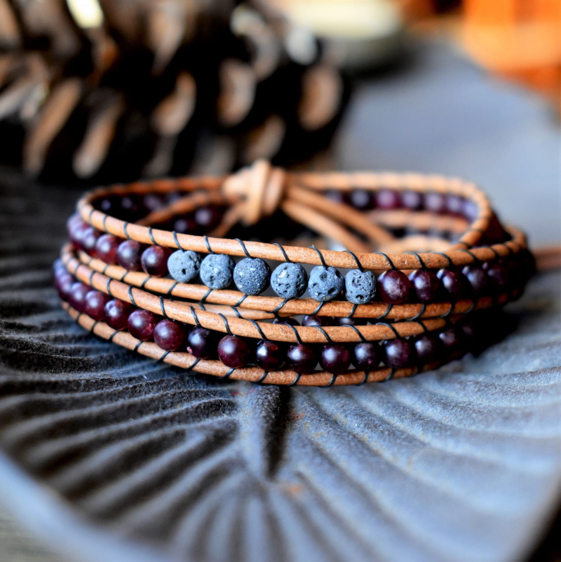 This wrap includes natural, unwaxed lava beads in addition to Garnet natural gemstone beads woven to natural leather with a metal button closure. Just place a few drops of your favorite essential oil on the lava beads, and your oil will diffuse throughout the day.