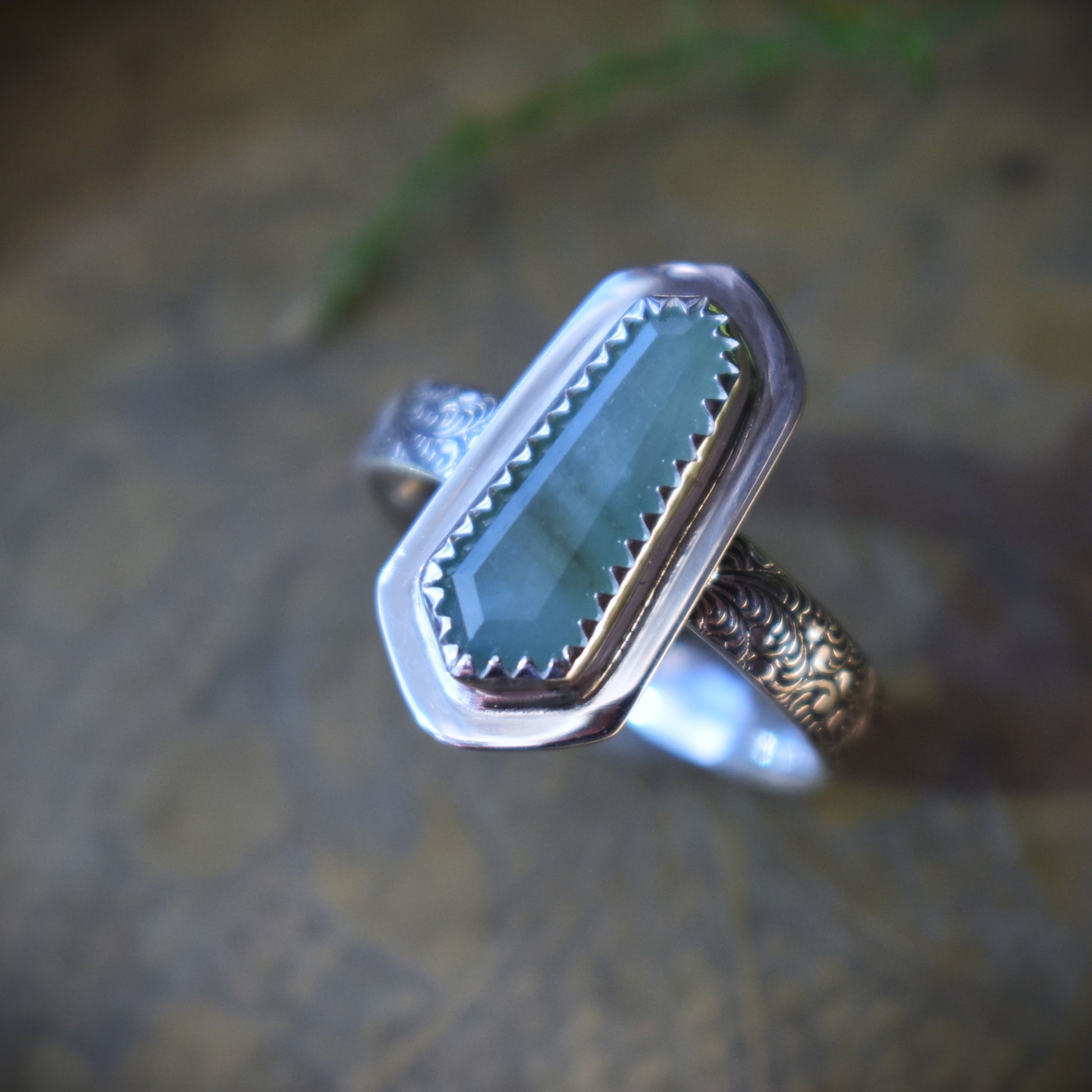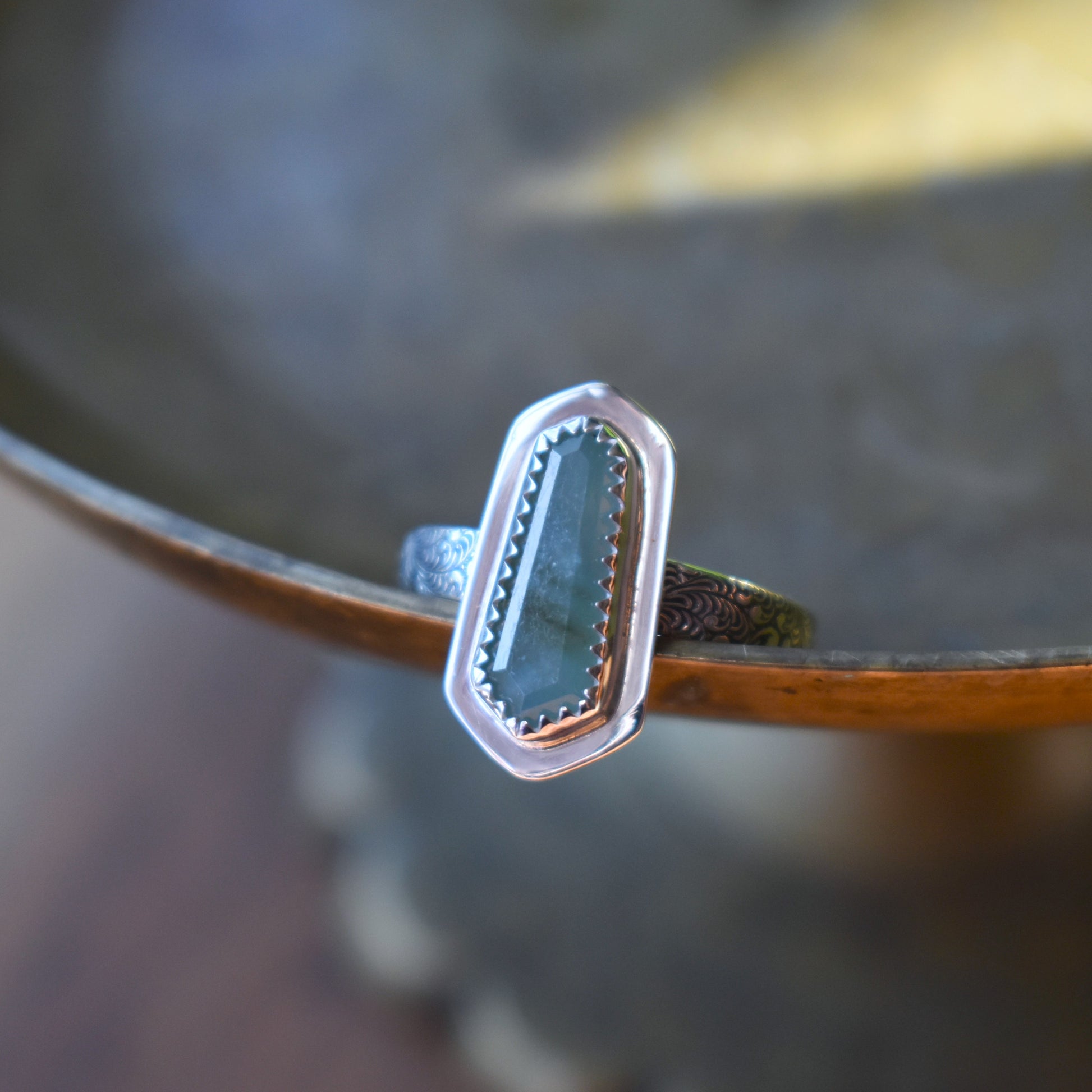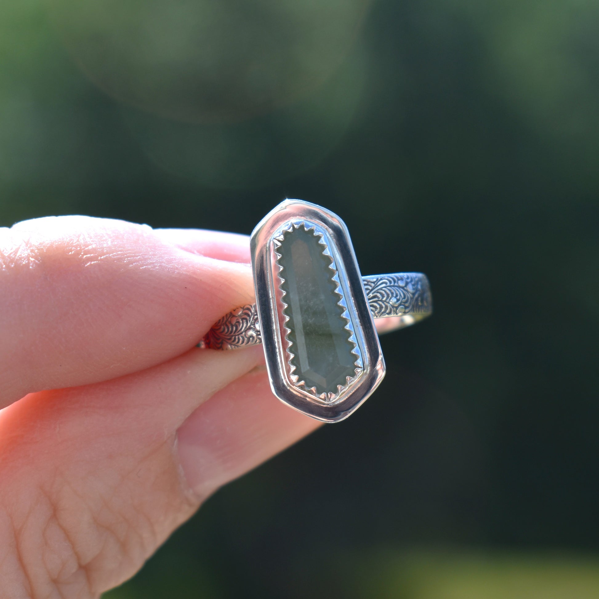 This stone is stunning - a hexagonal faceted Grandidierite is set in sterling silver atop a patterned sterling silver band. The stone is approximately 1/4" x 5/8" and features muted sage green hues.