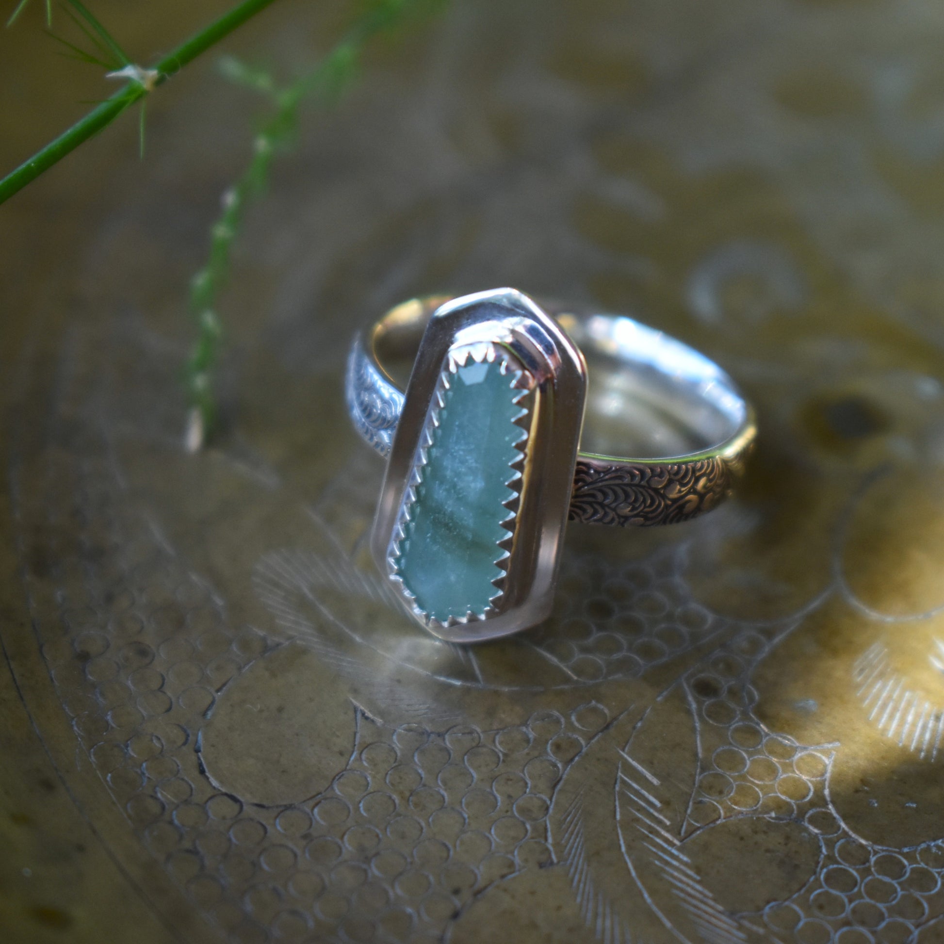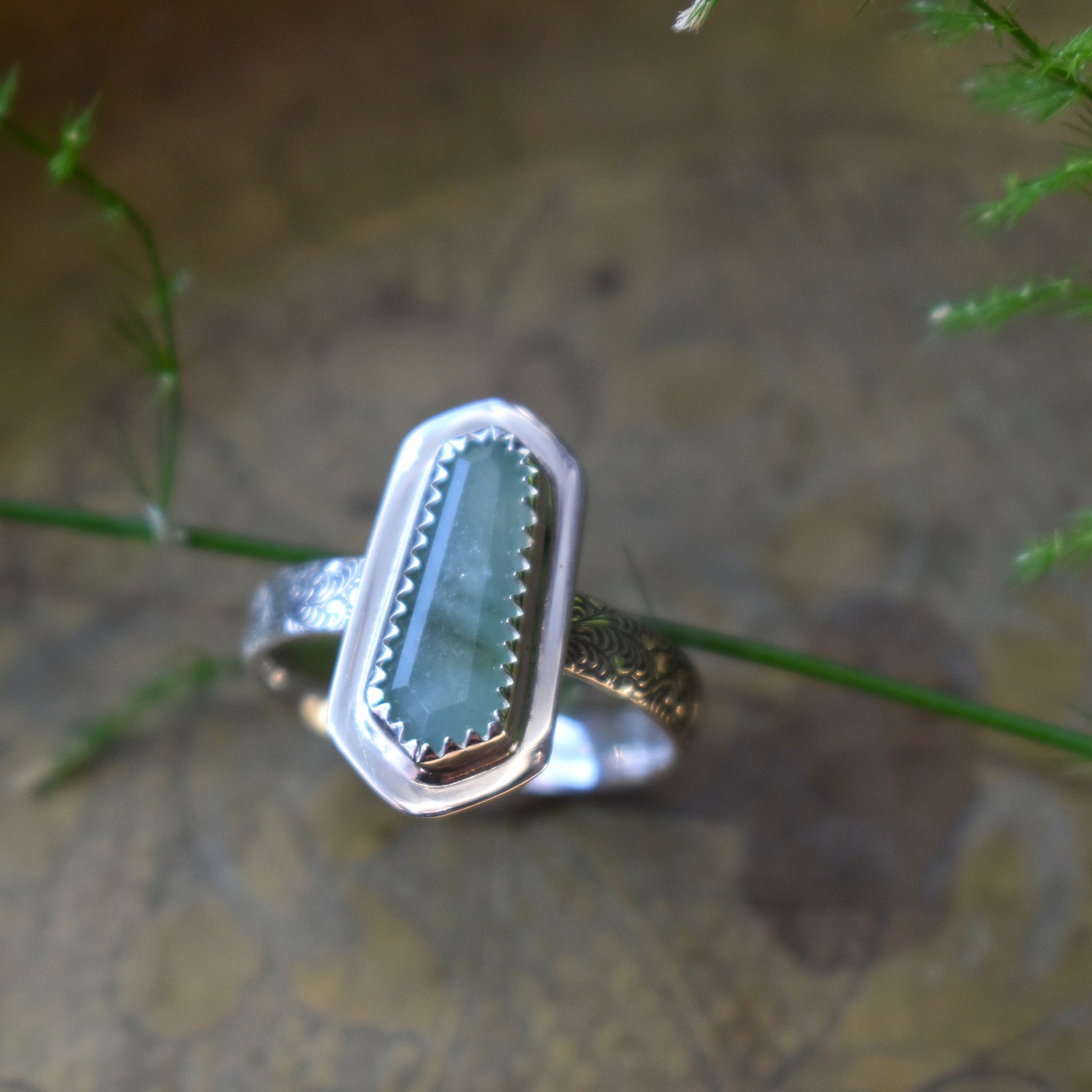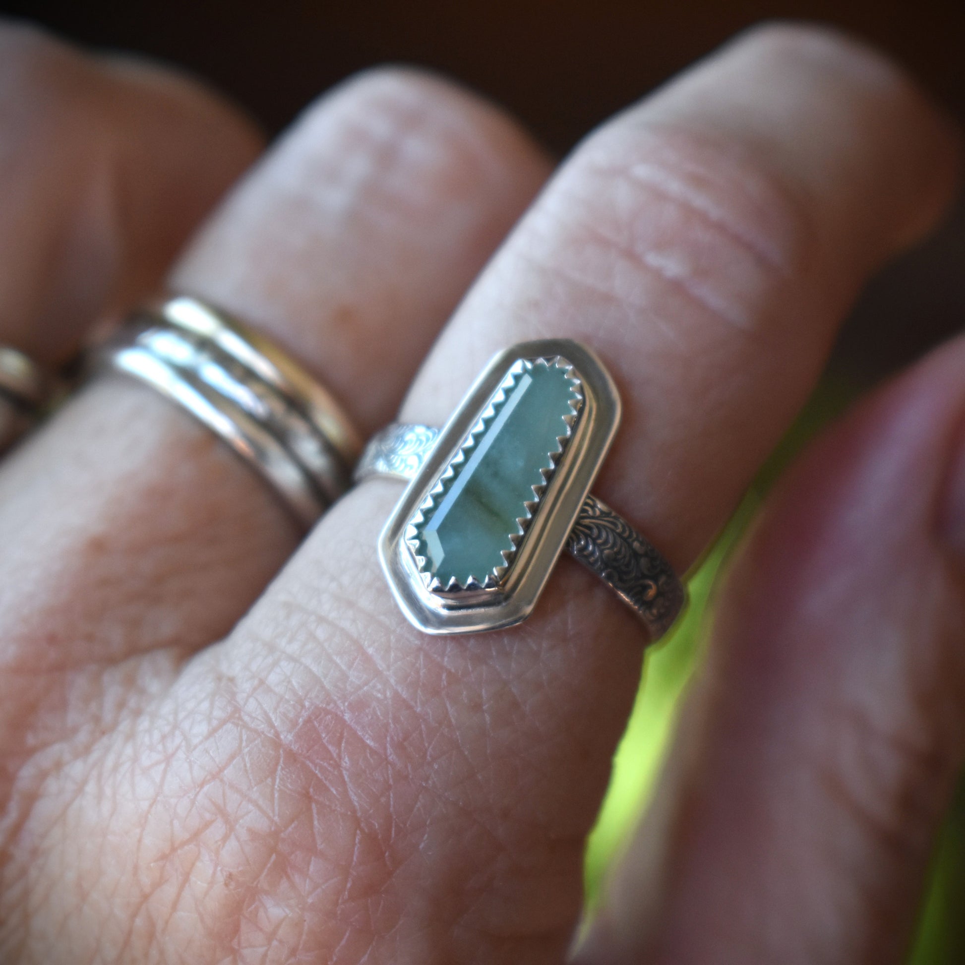 This stone is stunning - a hexagonal faceted Grandidierite is set in sterling silver atop a patterned sterling silver band. The stone is approximately 1/4" x 5/8" and features muted sage green hues.