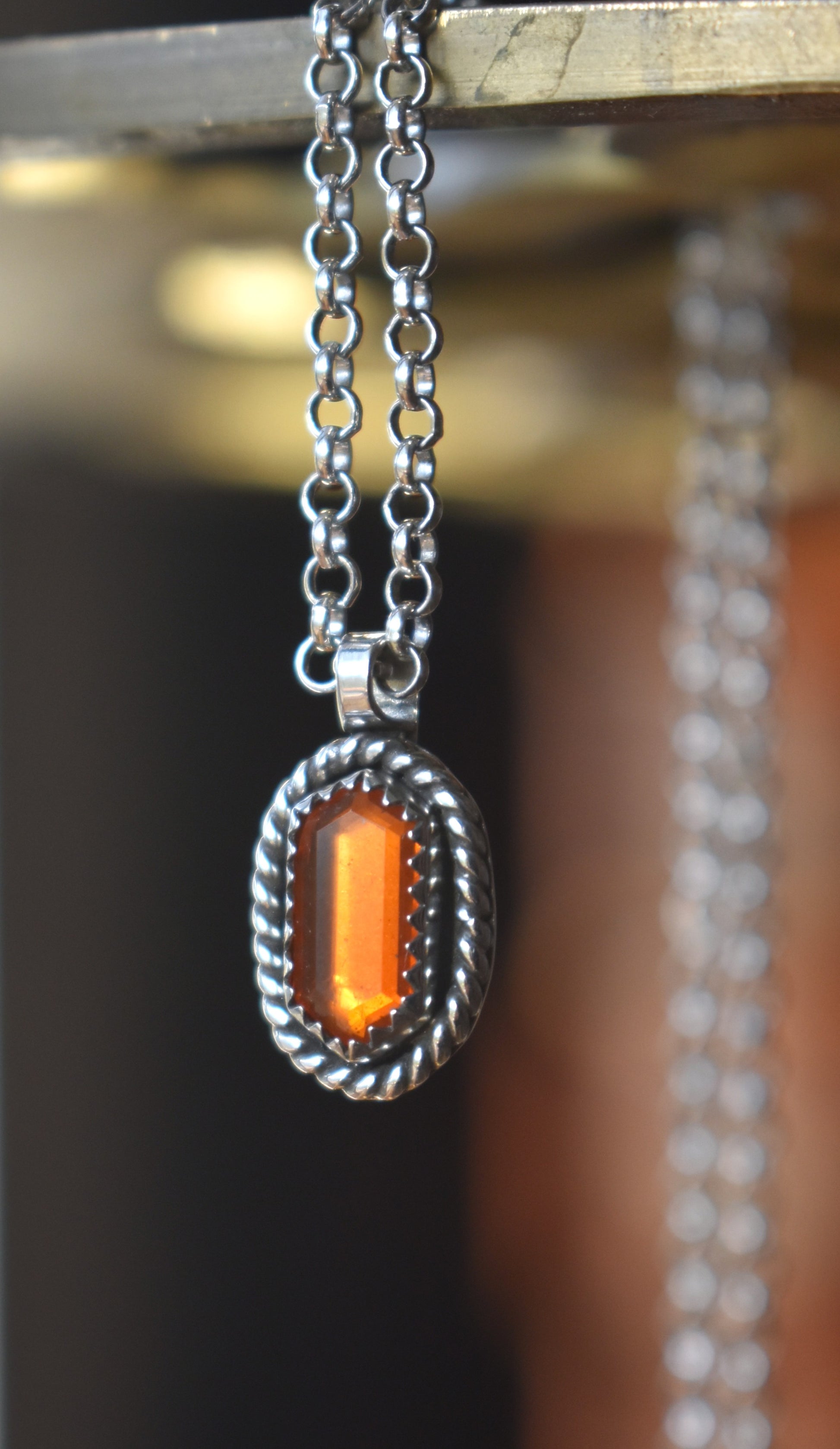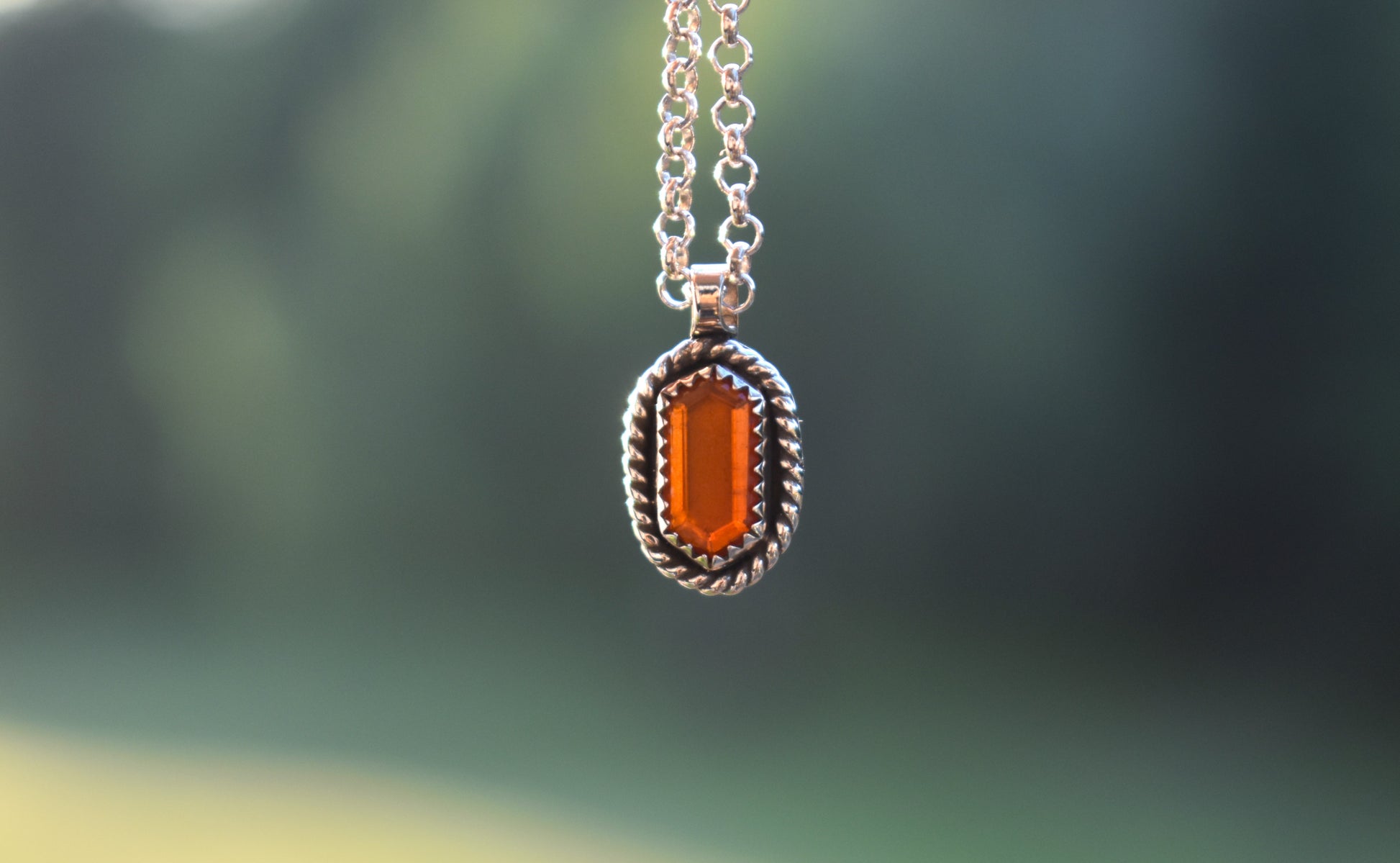 This tiny stunning stepped hexagon shaped Mexican Fire Opal is set in sterling silver, framed in twist wire and hung from a 16" sterling silver rolo chain.