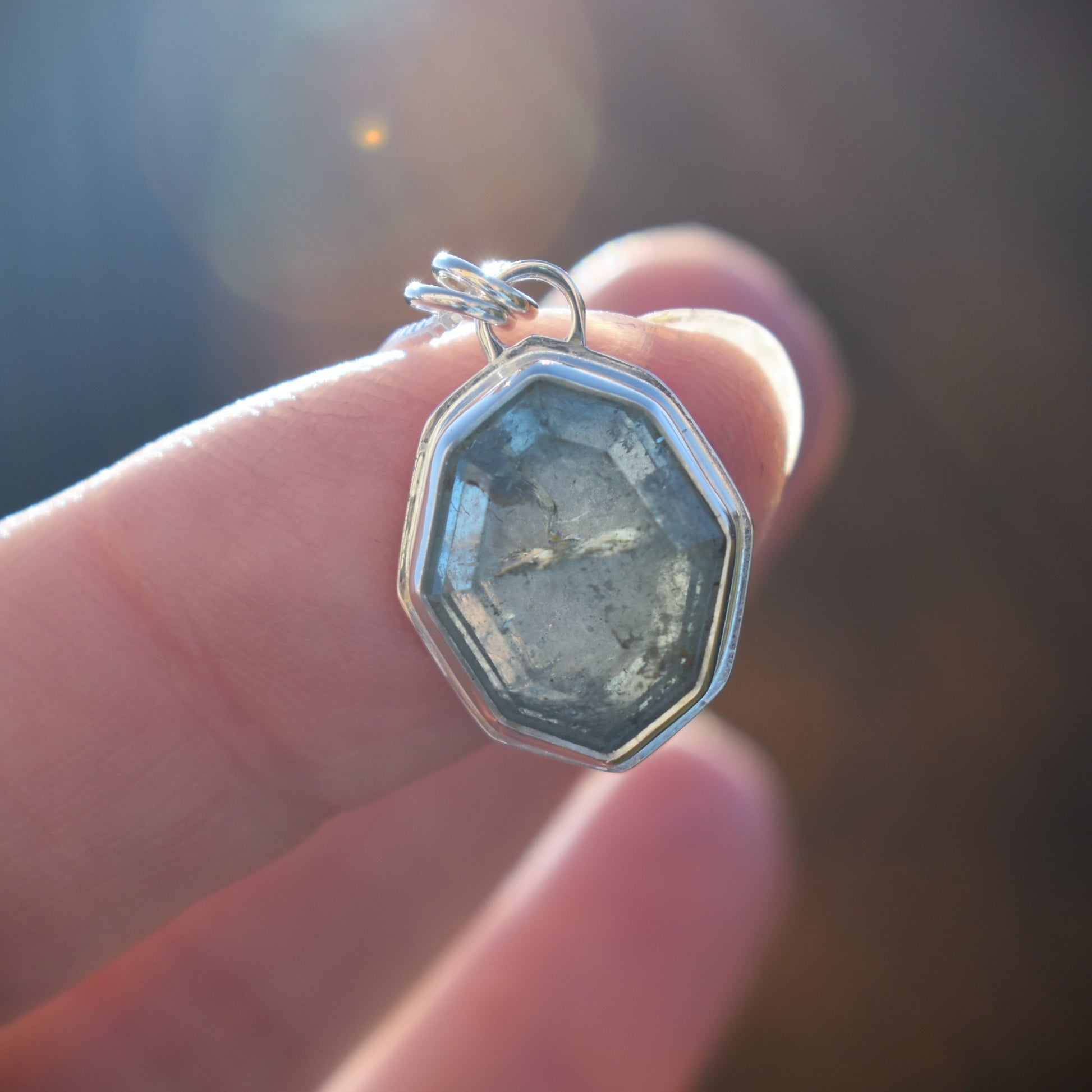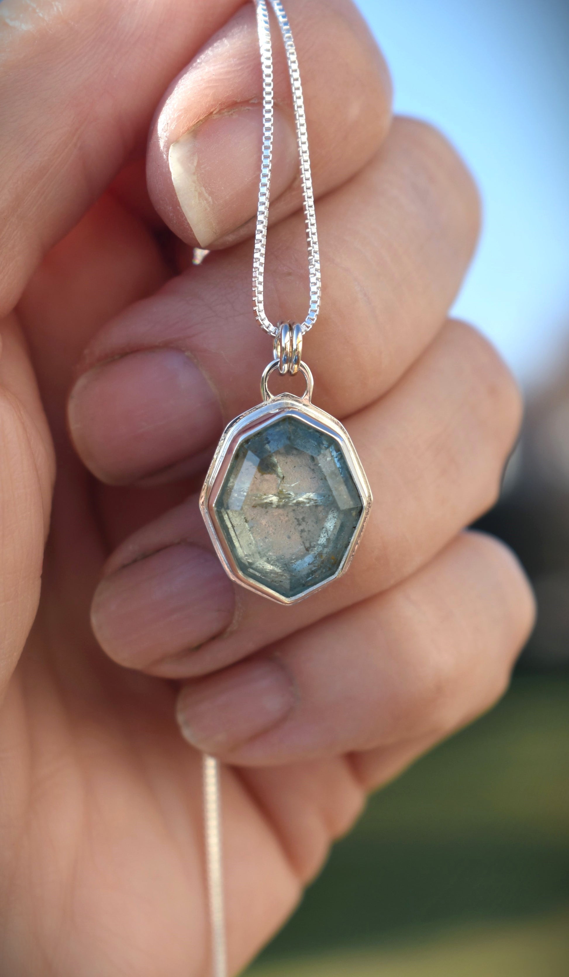 This stunning, faceted, ocean blue natural Aquamarine is set in sterling silver and hung from a 16" silky smooth sterling silver box chain.