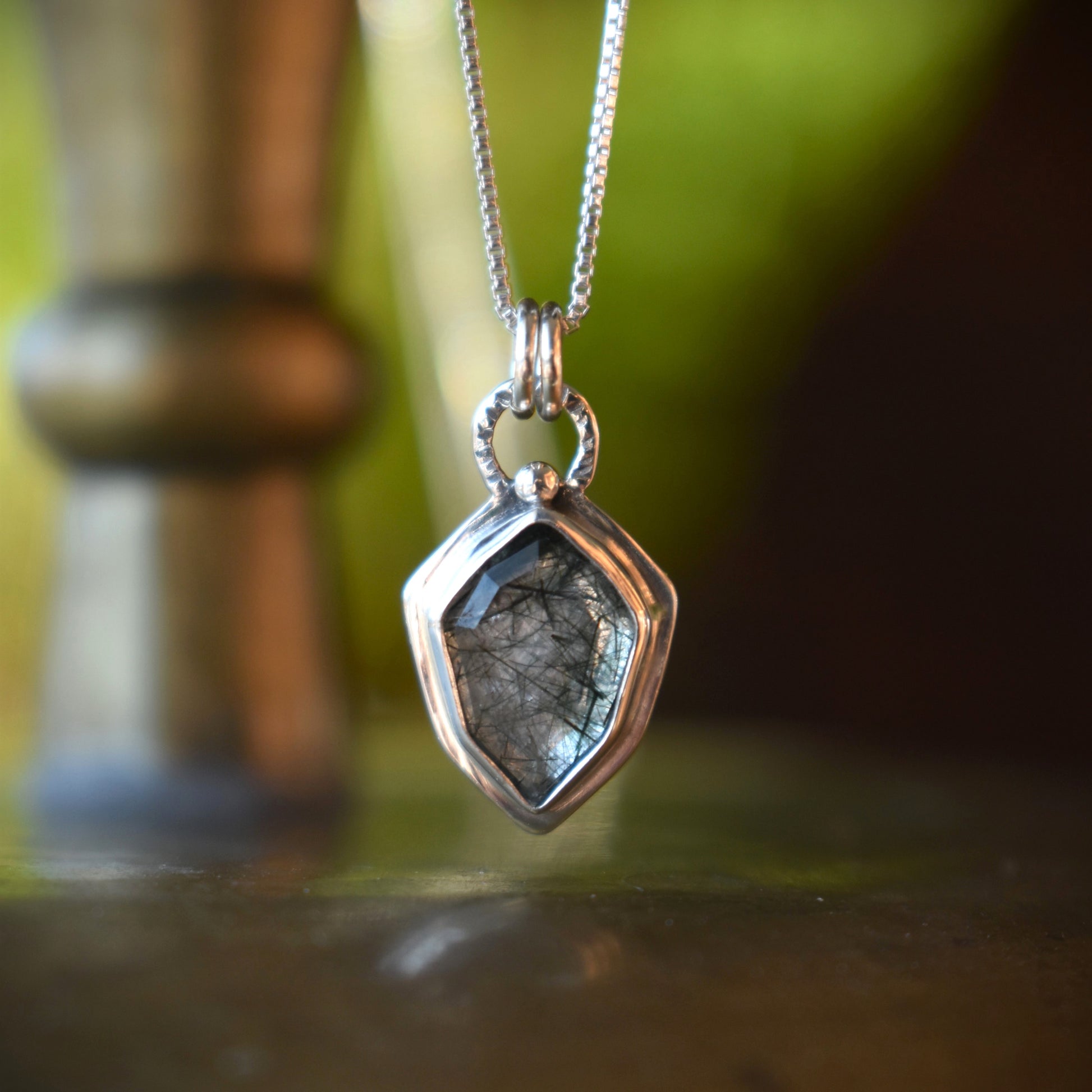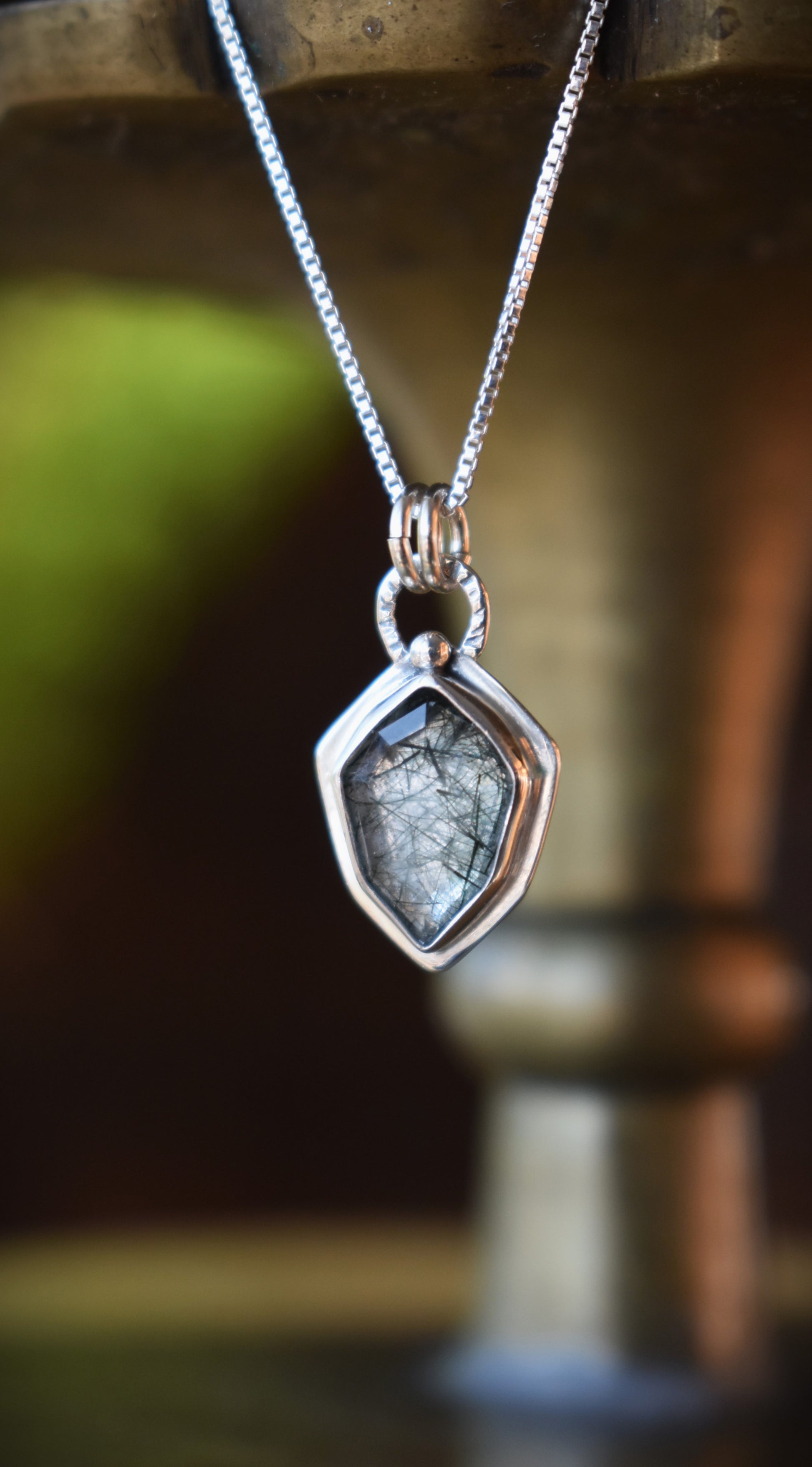 This tiny, faceted, quartz with needle-like inclusions is set in sterling silver and hung from an 18" silky smooth sterling silver box chain.