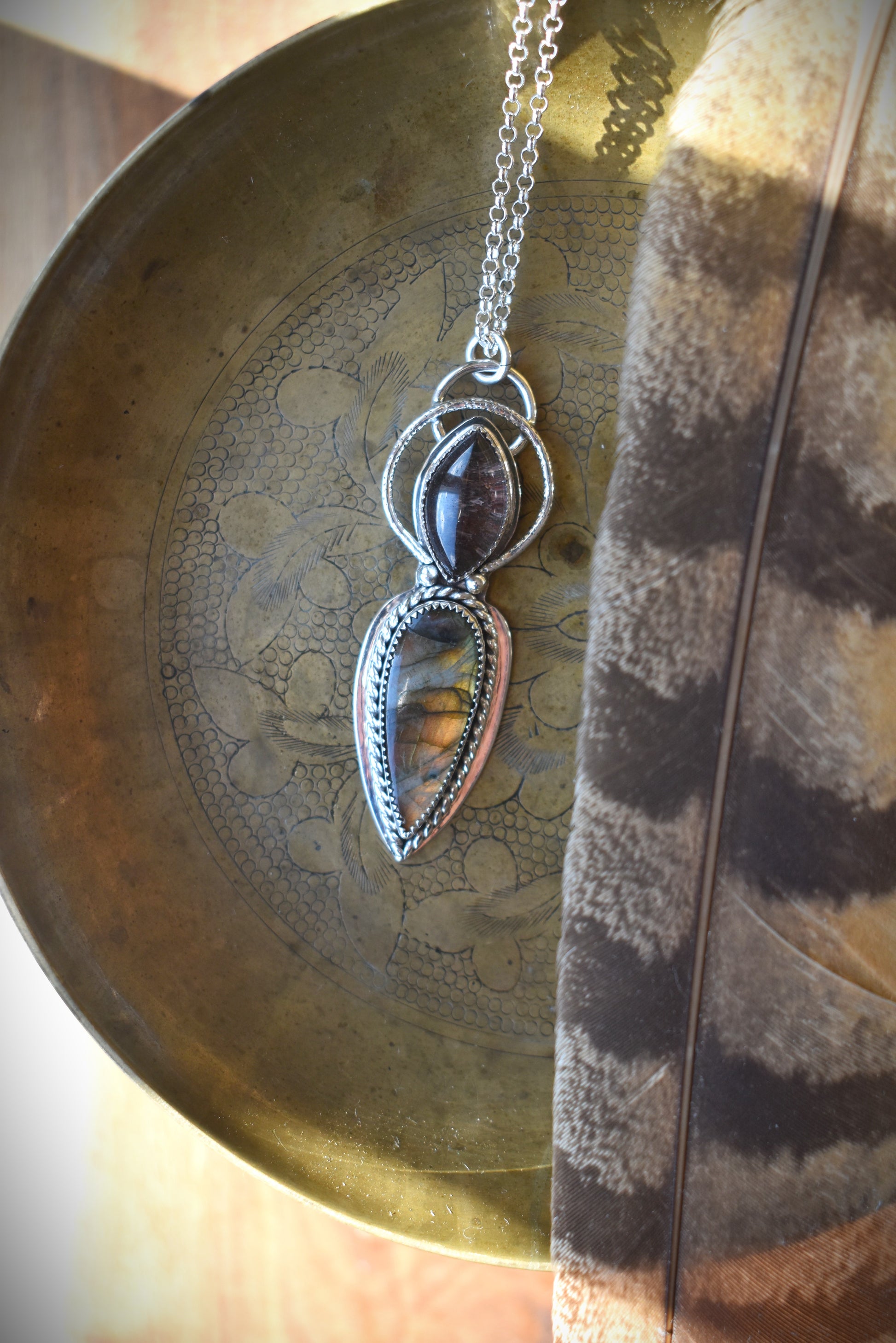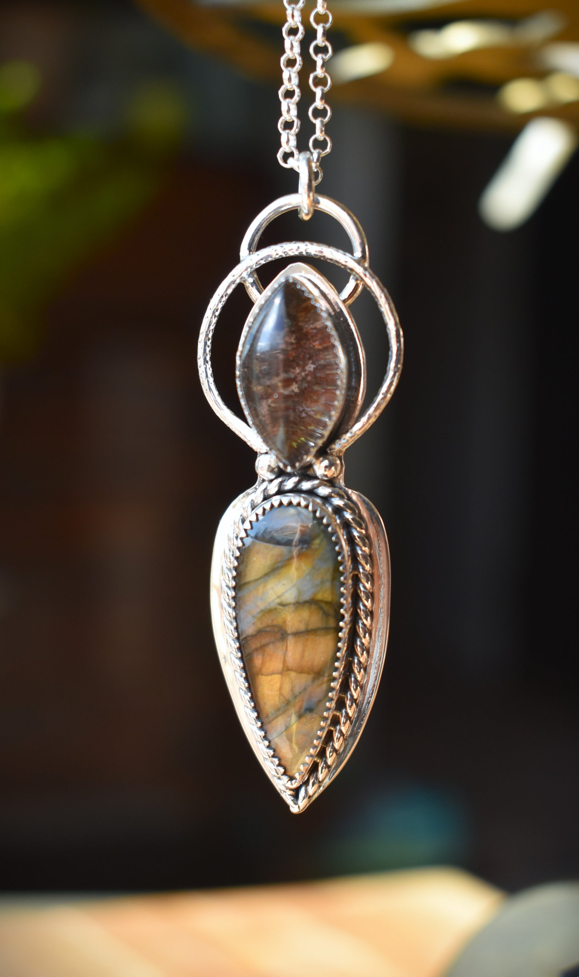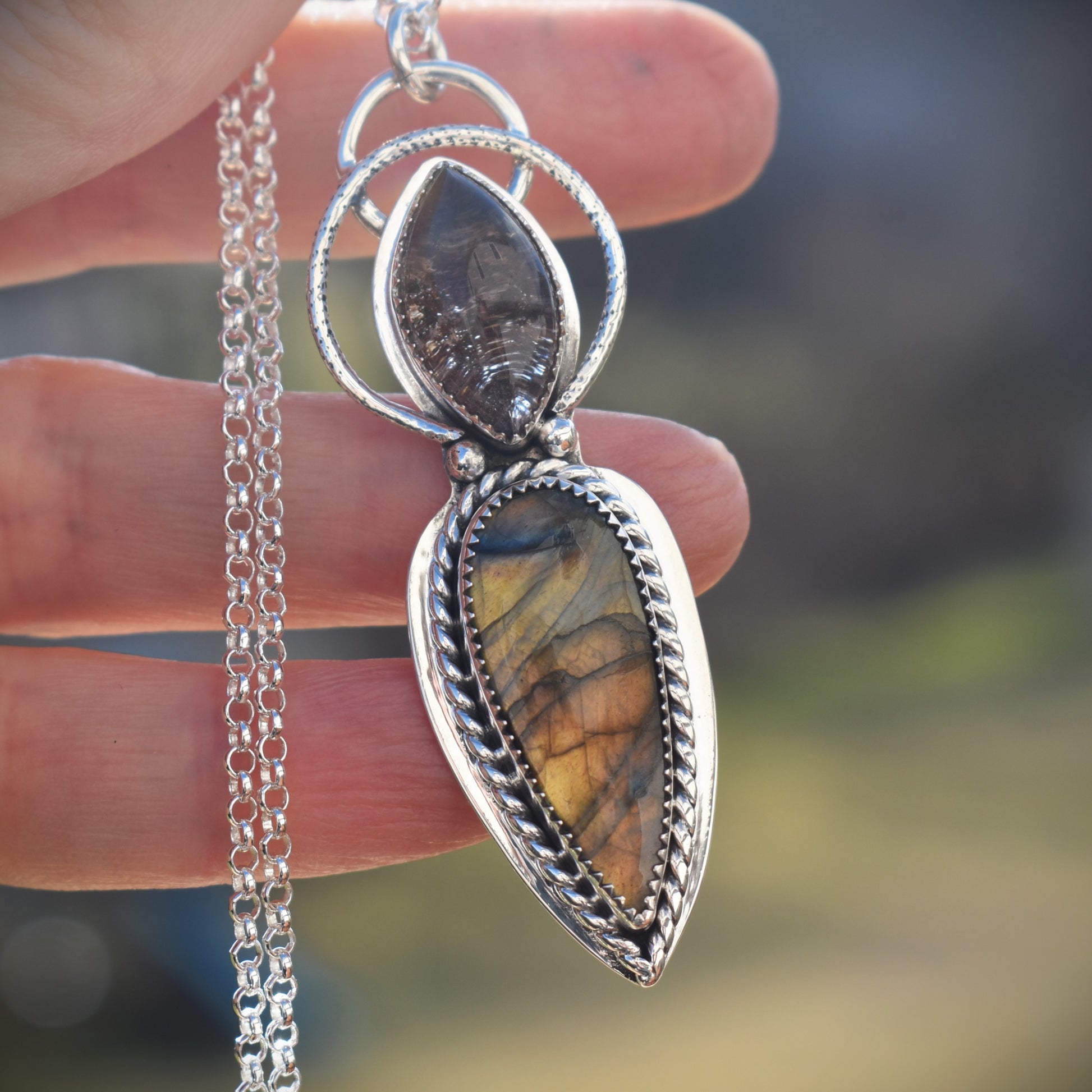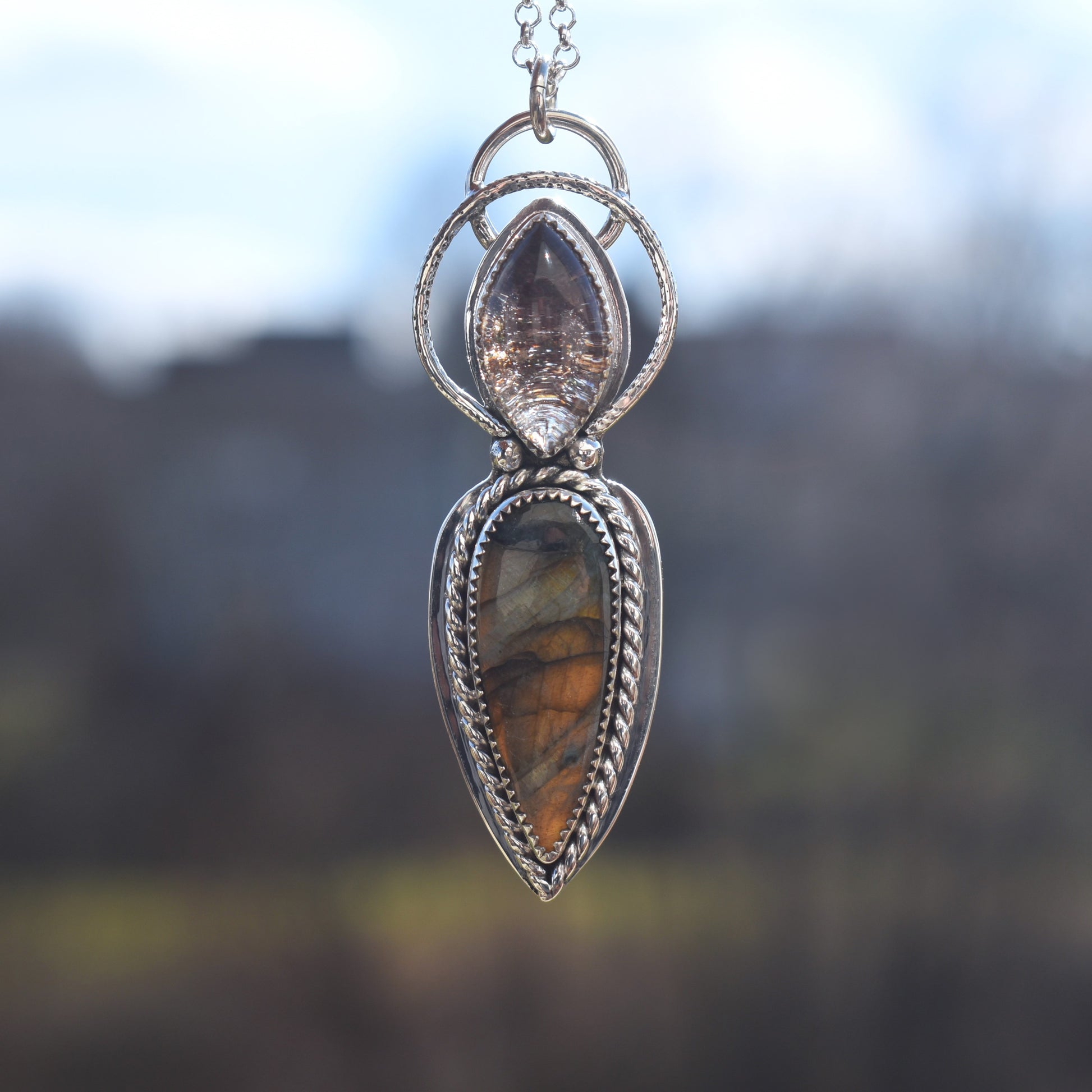 This Garden Quartz (also known as Lodolite) with internal, three-dimensional earth toned inclusions is set in serrated sterling silver. Below it is a gorgeous pear shaped labradorite with shade of brown, green, gold and blue, set also in serrated sterling silver and framed with twist wire.