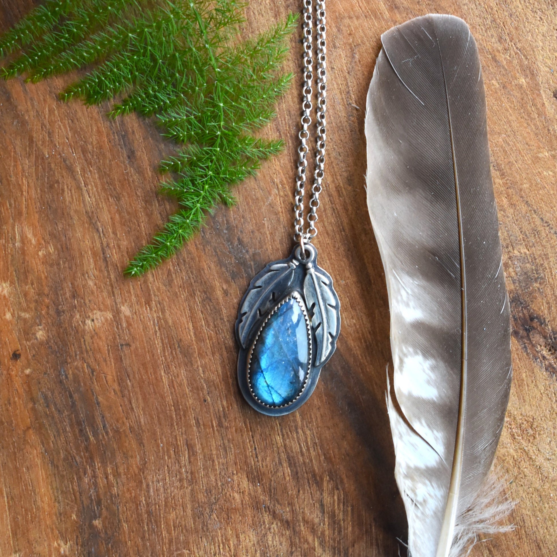 A gorgeous flashy blue labradorite teardrop has been set in sterling silver and is framed with two sterling silver feathers.