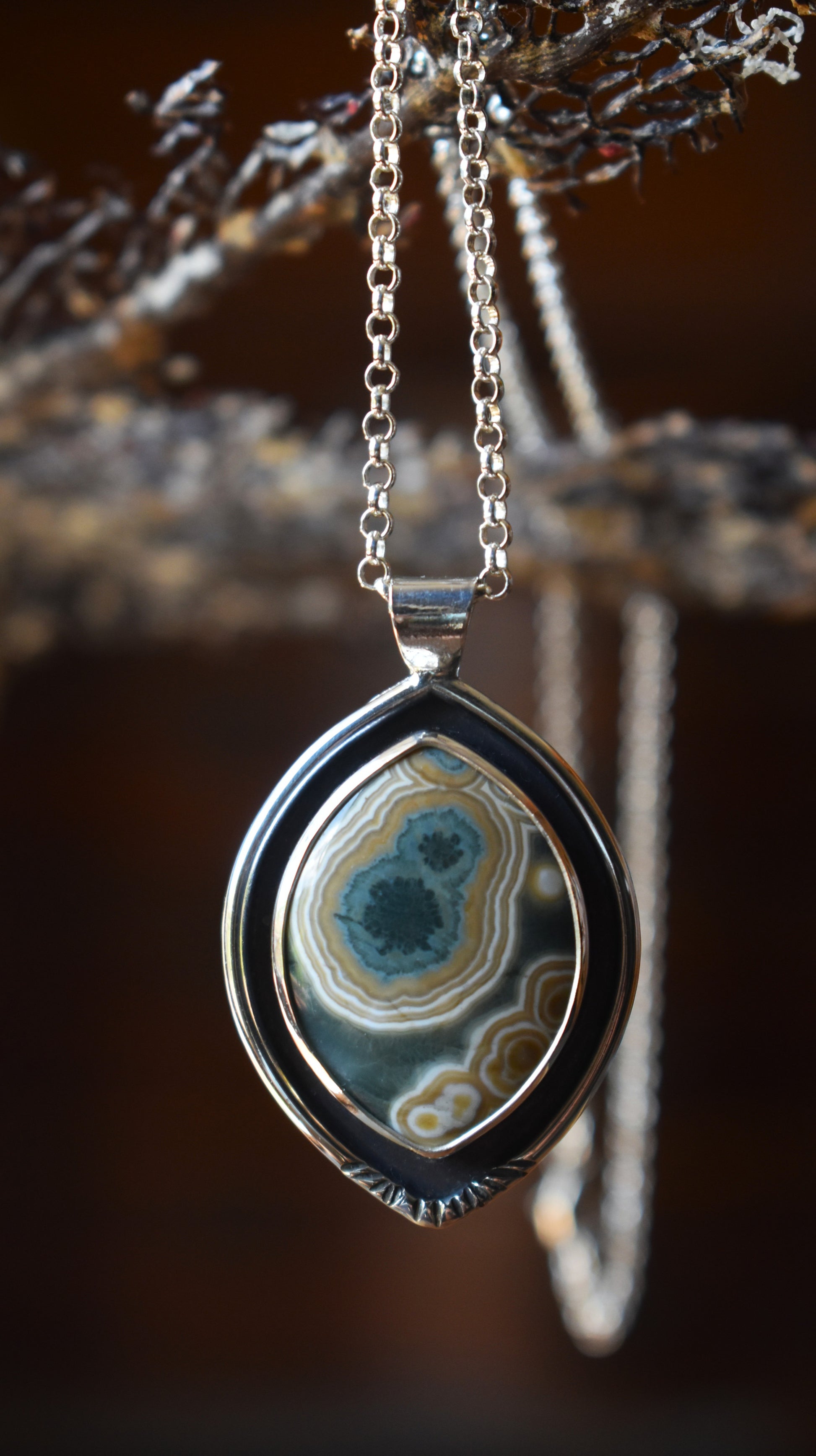 This gorgeous stone with stunning green tones is set in sterling silver and framed by shiny sterling hand stamped wire. The piece is hung on a 16" sterling silver rolo chain with an additional 2-inch extender.