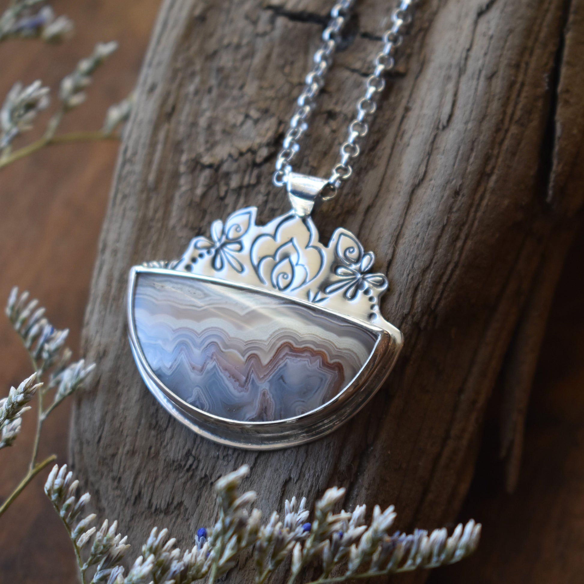 This gorgeous agate with stunning muted tones of gray, terra cotta, beige and cream is set in sterling silver and accented with shiny hand stamped sterling with a handmade bail. The piece is hung on a 16" sterling silver rolo chain with an additional 2-inch extender.