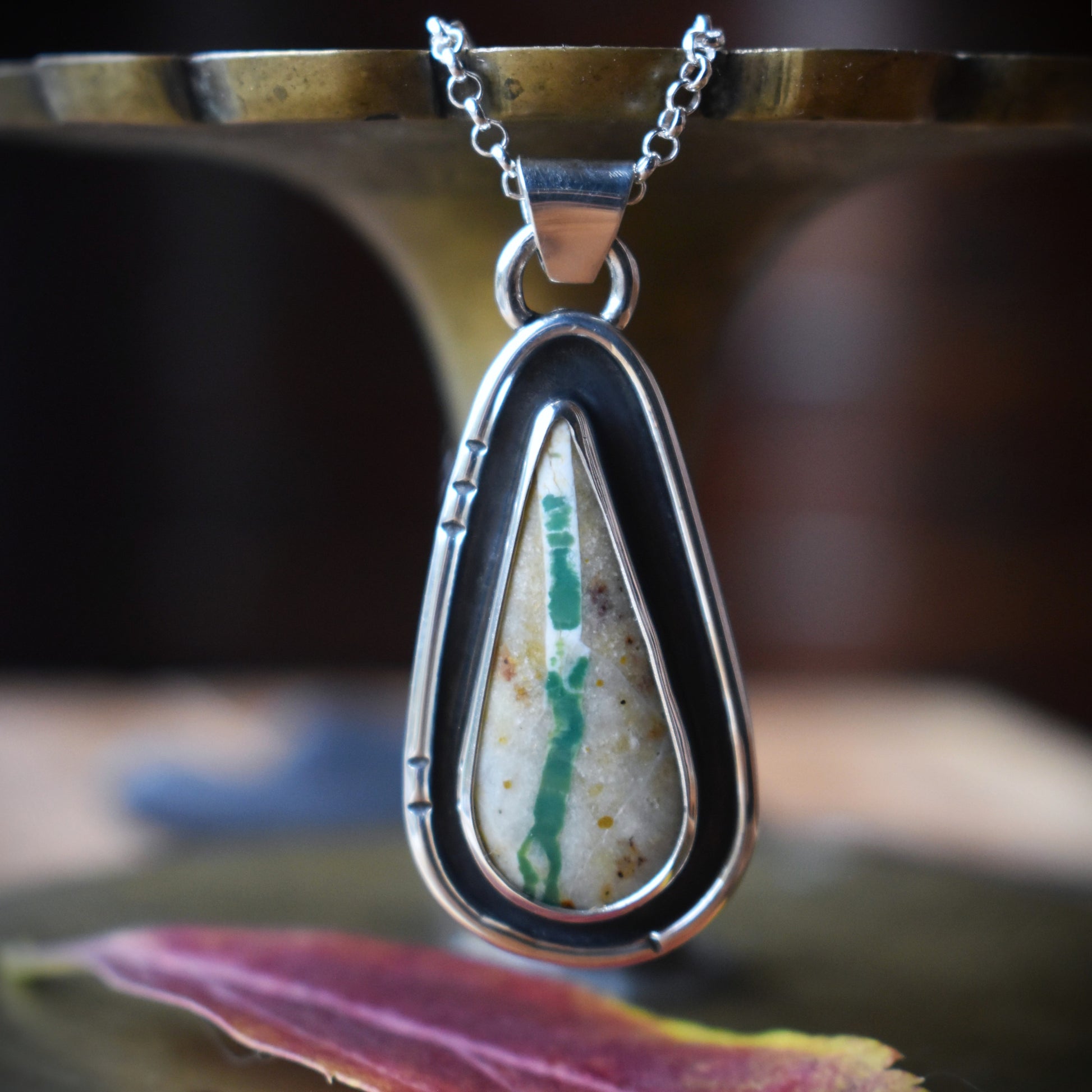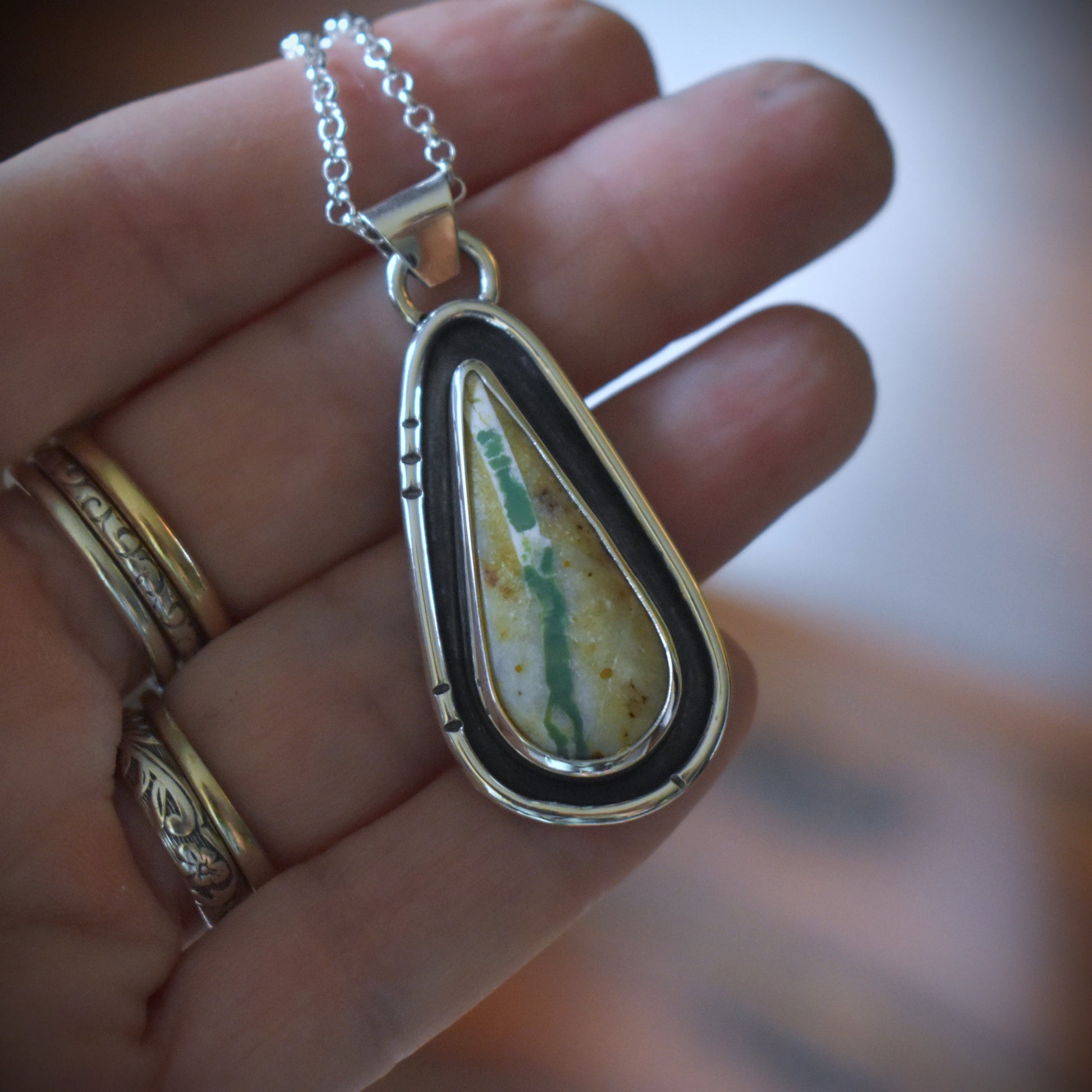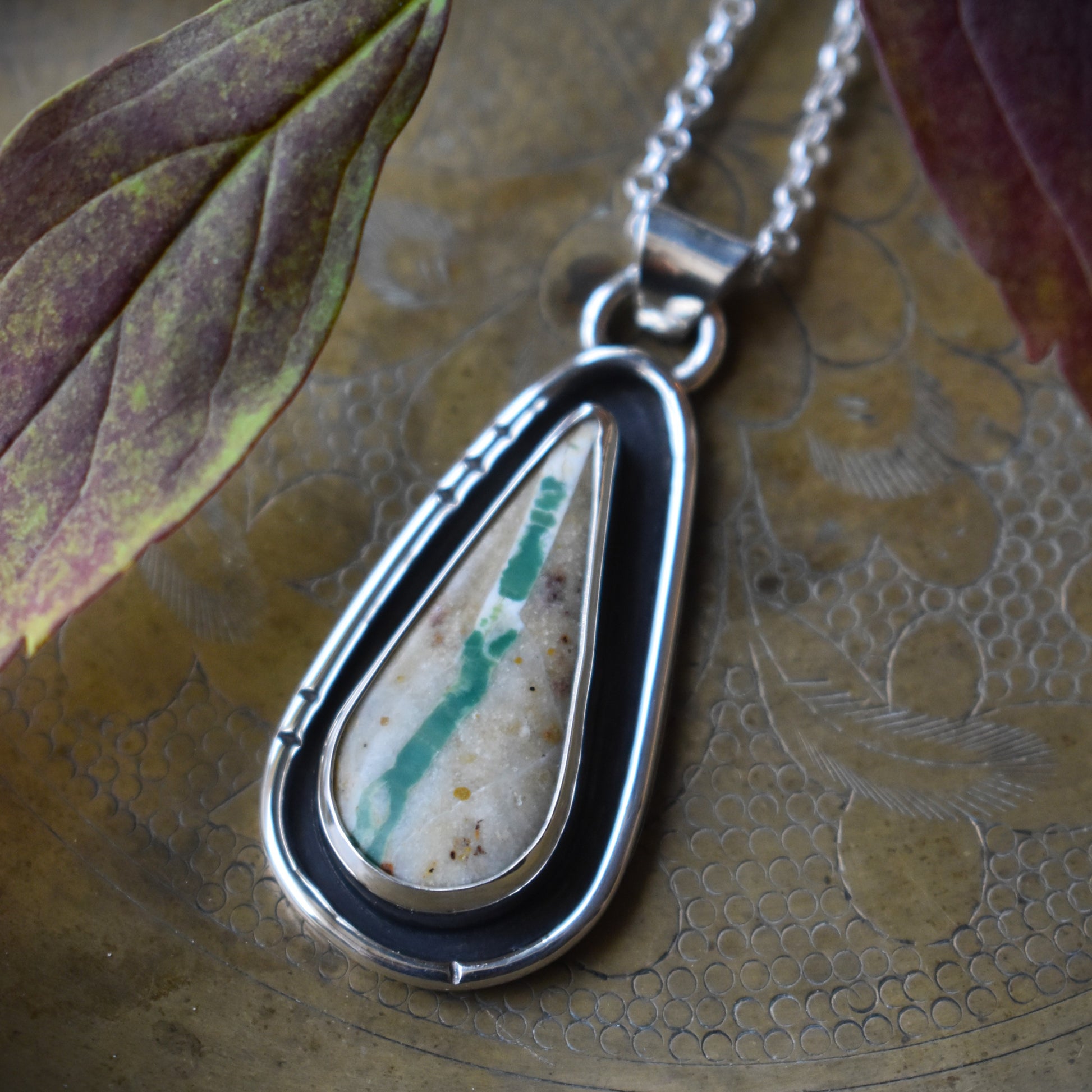 This pretty turquoise necklace features a gorgeous Royston Ribbon, set shadowbox-style, accented with hand stamping and hung from a hand forged bail.