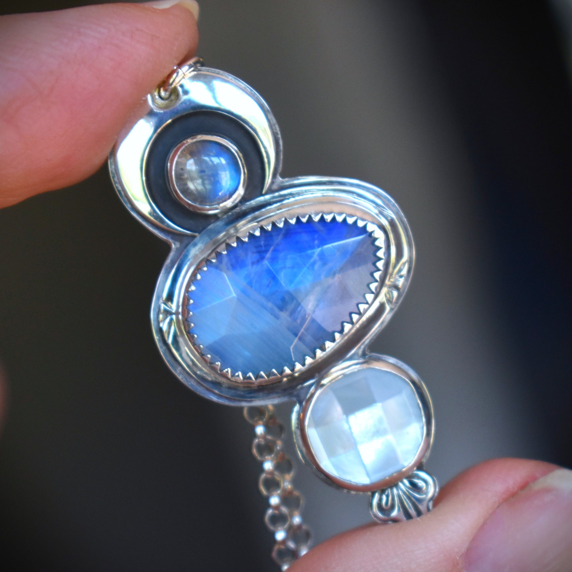 Two gorgeous, flashy Rainbow Moonstones and a single checkerboard cut Mother of Pearl are set in sterling silver and accented with hand stamping, a crescent moon and a pretty little flourish.